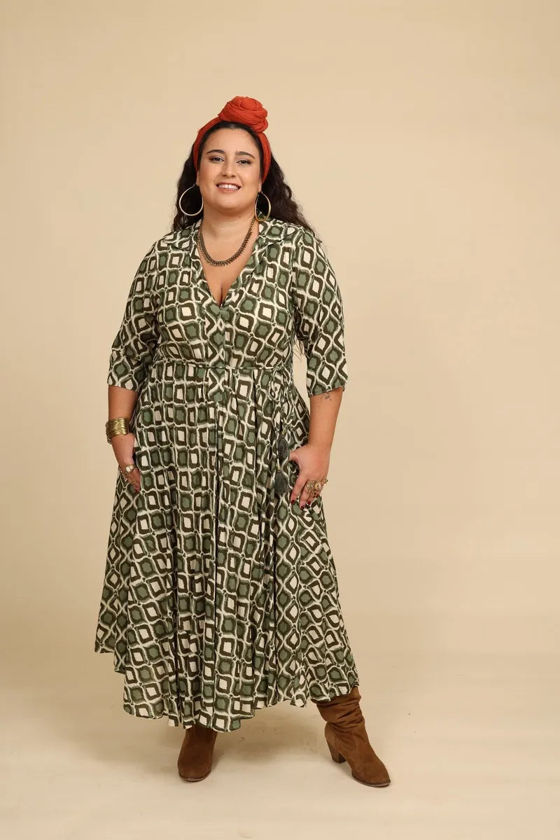 3-4 מקביל למידה 42-44 | היקף החזה – עד 120 ס’’מ | אורך שרוול – 41 ס’’מ | אורך שמלה – 126 ס’’מ.