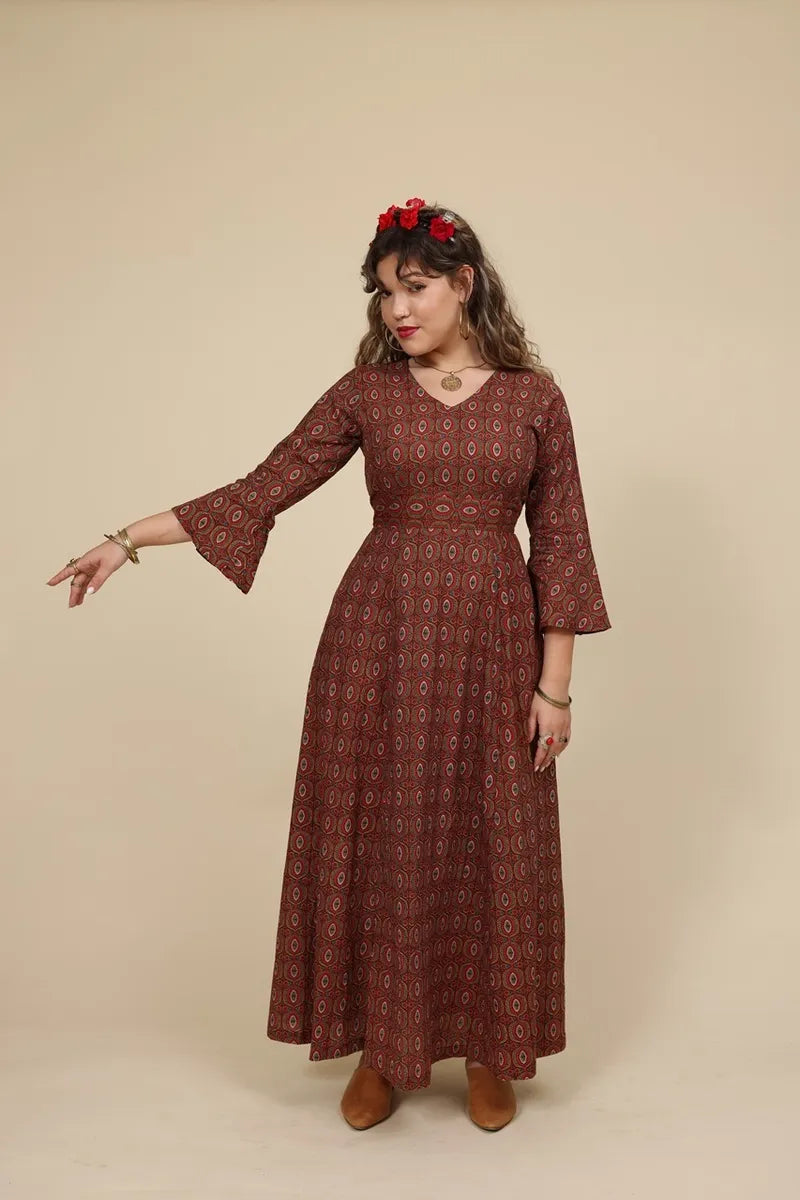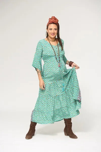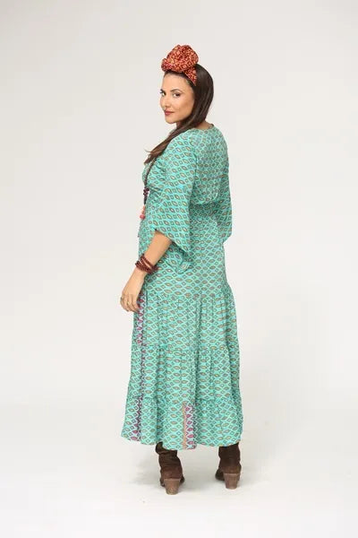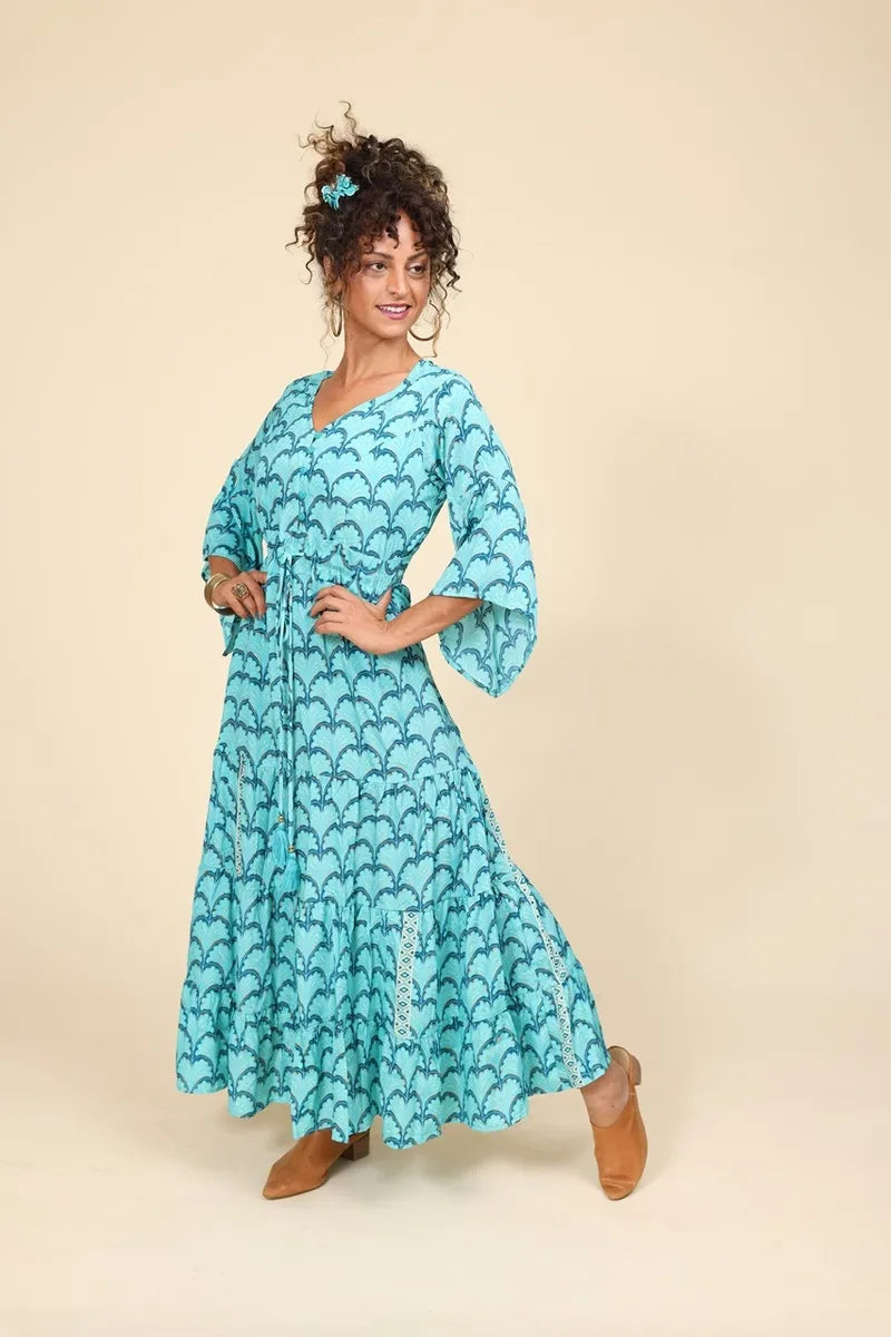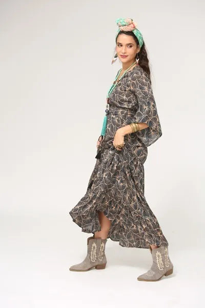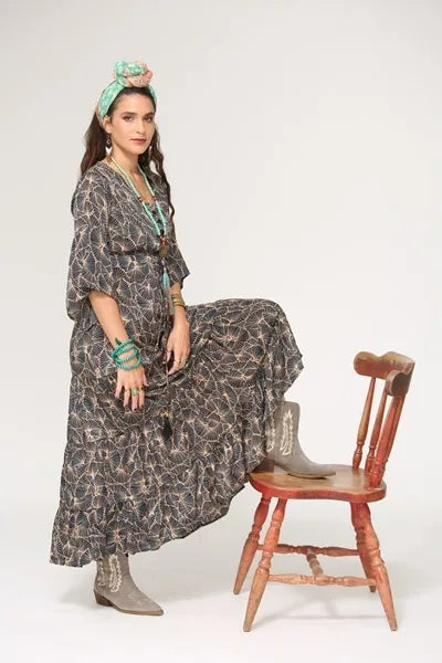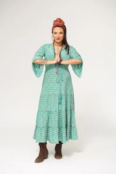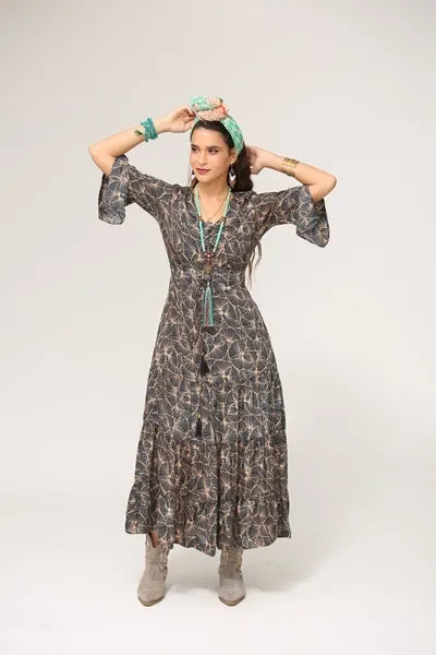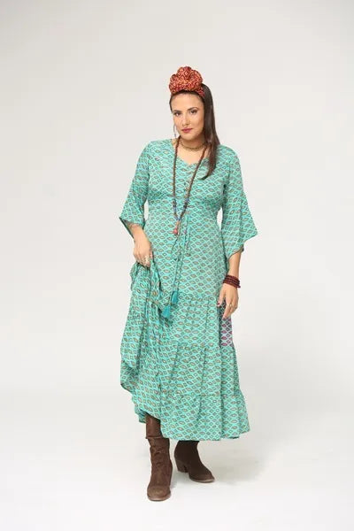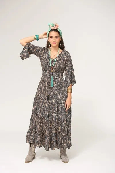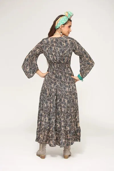 שמלה באורך מקסי עם שרוולים מתרחבים המעניקה מראה קסום ומיוחד.